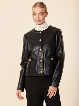 Refine your Fall style with our faux leather jacket, featuring a textured finish, gold statement buttons, and a classic round neckline. Designed with front patch pockets and tailored seams, this chic outerwear piece adds elegance to women’s Fall fashion...