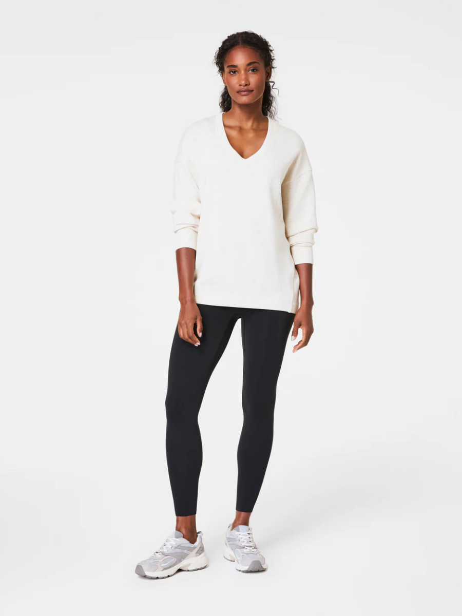 Our AirEssentials Brushed V-Neck Tunic is made with our super-soft spacer fabric that's lightweight, breathable, and feels silky smooth. Designed with a v-neck cut, a longer hem for when you want a little extra booty coverage, and a gently-brushed interior for a peachy-soft feel, this sweatshirt ensures you stay cozy when lounging, or on-the-go during the colder months.