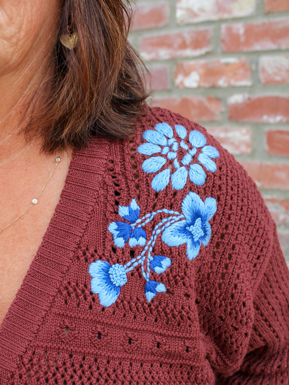 A super soft cardigan featuring textured pointelle stitches and floral embroidery by artisans in India.