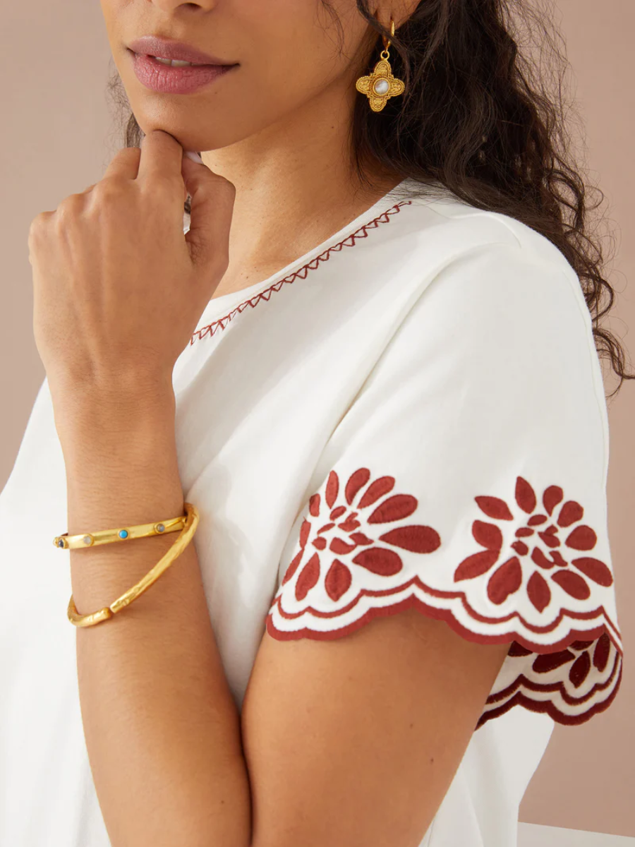 This classic tee in a relaxed silhouette features a floral embroidered scallop sleeve.