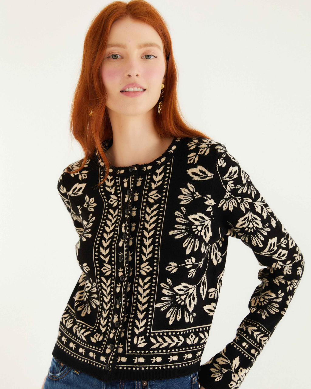 Embrace the cozy charm of this Black and White Flower Bloom Buttoned Knit Cardigan from FARM Rio. Its soft knitwear showcases a harmonious blend of bold black and delicate white floral patterns, creating a playful yet elegant contrast. The round neckline frames the face gently, while the buttoned front invites effortless layering. Perfect for adding a touch of warmth and whimsical beauty to your everyday wardrobe.