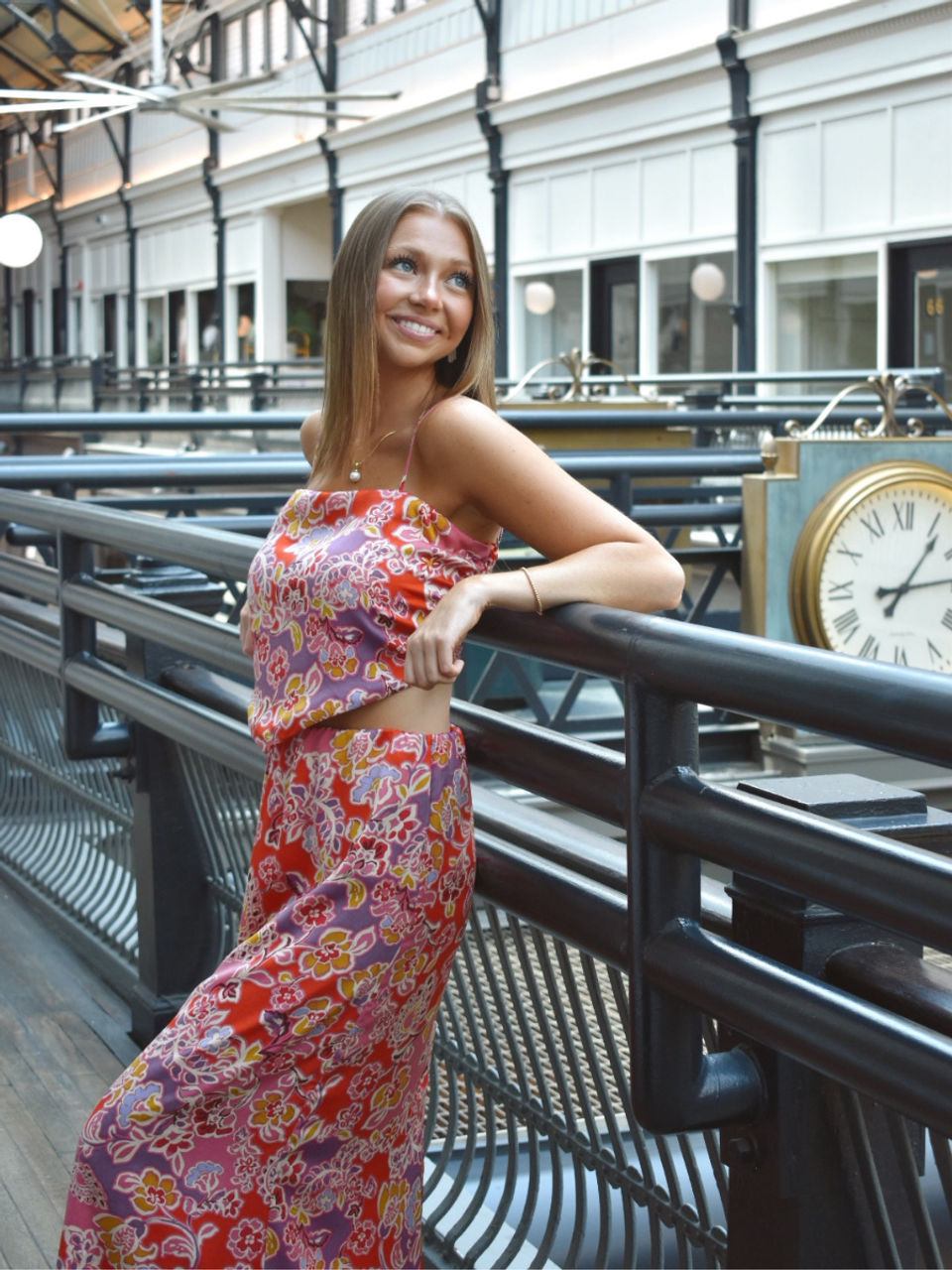 Satin handkerchief inspired cropped top with adjustable straps. Pair with the matching skirt or mix + match!