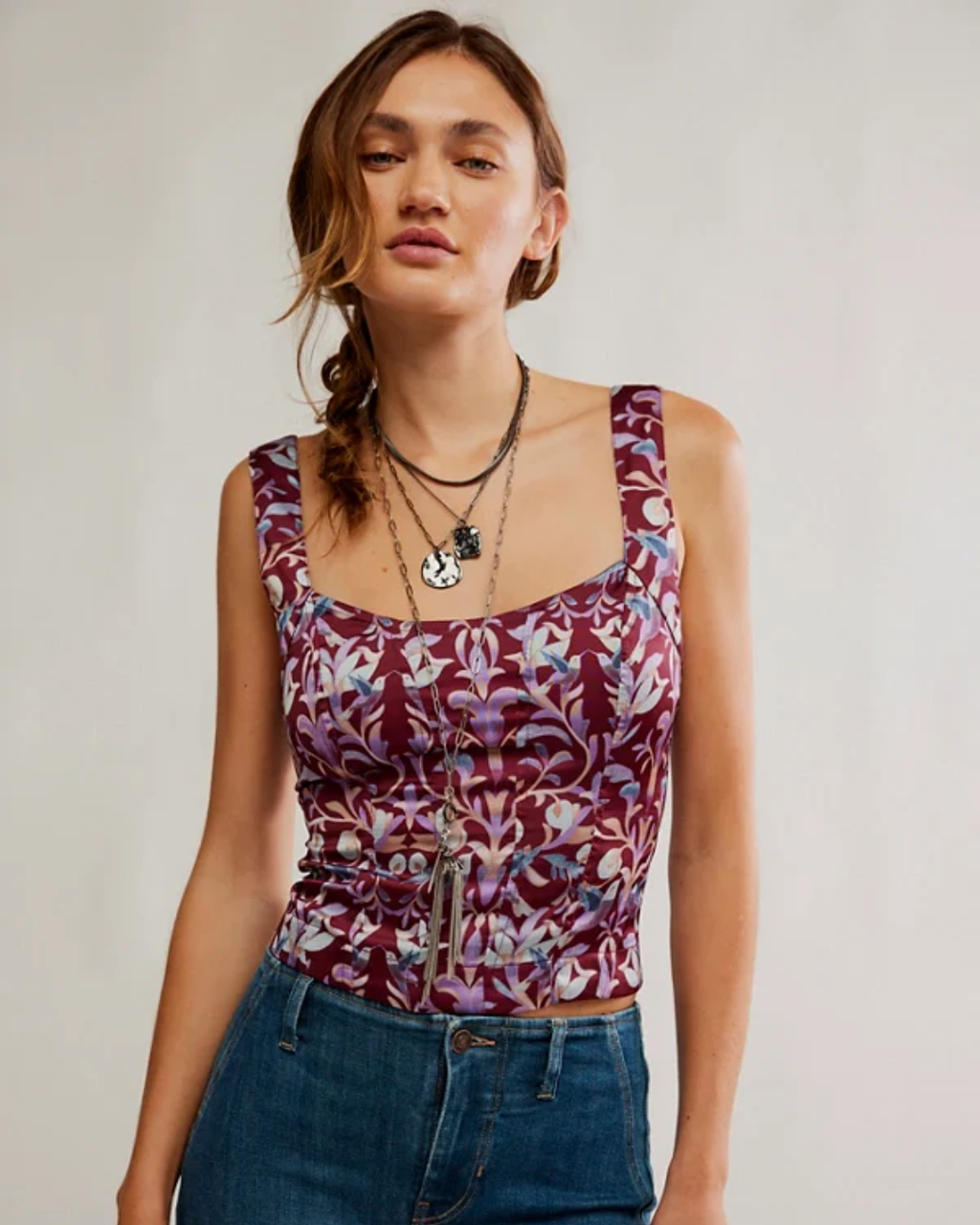 Elevate any look with this bold corset-style top, featuring luxe satiny fabrication, a subtle sweetheart neckline, and a cropped, fitted bodice for a flattering design.