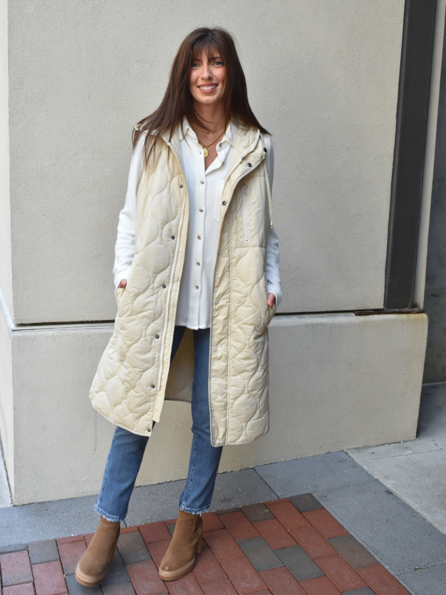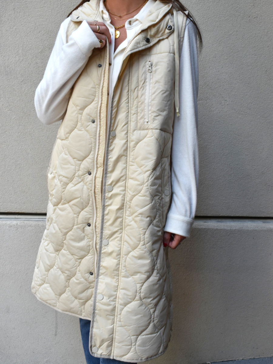 Stay extra warm and chic in this textured knit vest with cozy insulation! Featuring a knee length, an attached drawstring hood, side snap-button closures, and a zippered front with snap-button closures, for a flattering and versatile layered style.