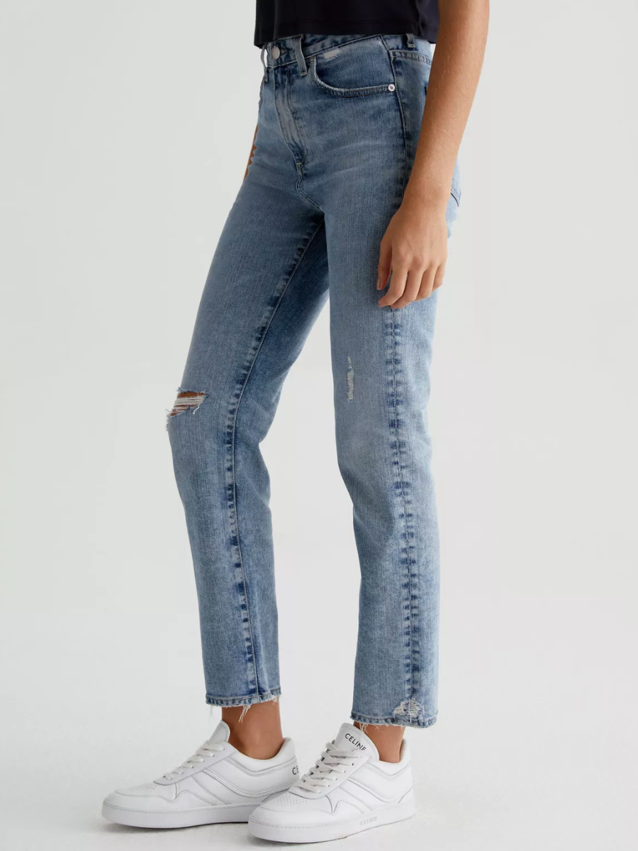 Designed in stretch-blend 11 oz. Lead Denim, this pair features a light wash, destruction, and worn hems with distressing at the sides. An angled yoke and slightly forward side seams flatter the fit.
