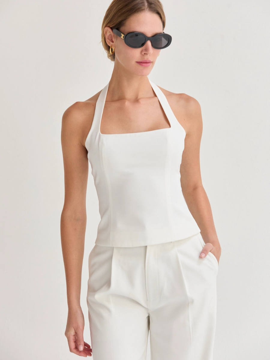Sharp and refined, the Sasha Tailored Halter Top features a sleek halter neckline and a sculpted fitted bodice for a polished, modern finish. Fully lined with a clean back zipper closure, it pairs seamlessly with the matching trousers.