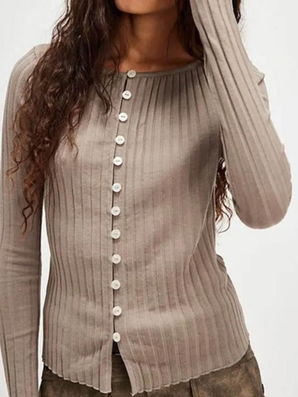Features: Stretchy ribbed knit fabrication, scoop-neckline, button closures, fitted long-sleeves