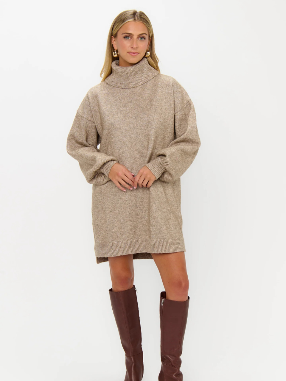 This neutral sweater dress has mastered the comfy-chic look! With a turtleneck and perfect balloon sleeves, this knit mini is an effortless closet must have!