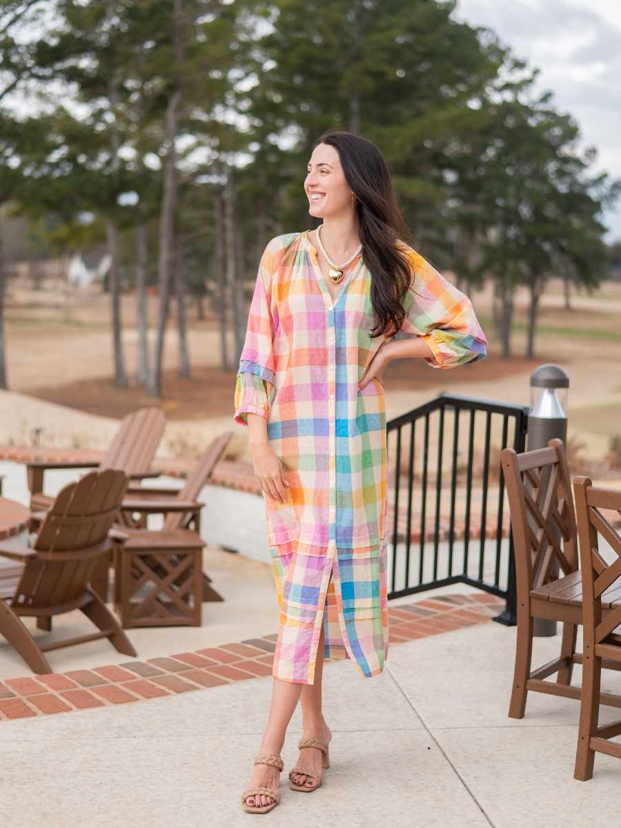 The Cleo Dress features a flowy tiered silhouette with long blouson sleeves, side pockets, and an easy button-front design. Wear it loose over a swimsuit or cinched with a belt for a polished vacation look.