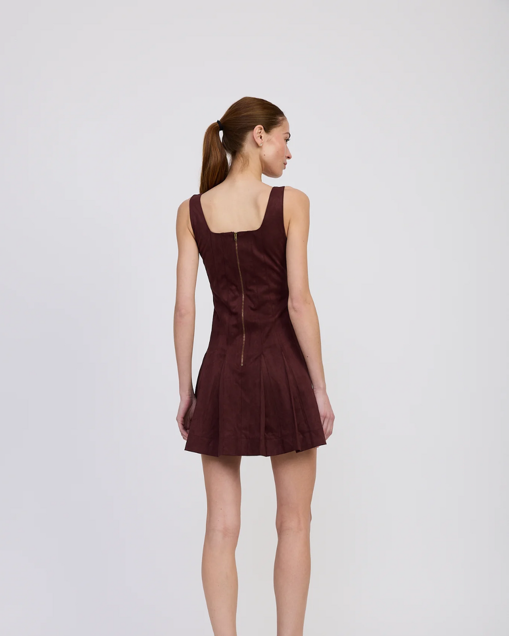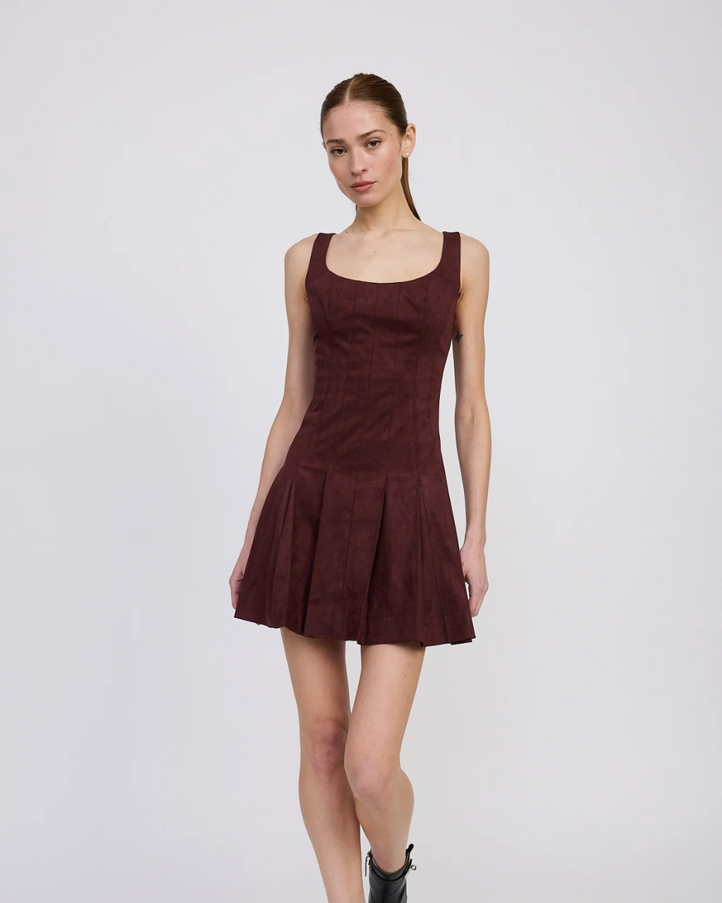 - Faux Suede Square Scoop Neck Seam Detailed Pleated Mini Dress