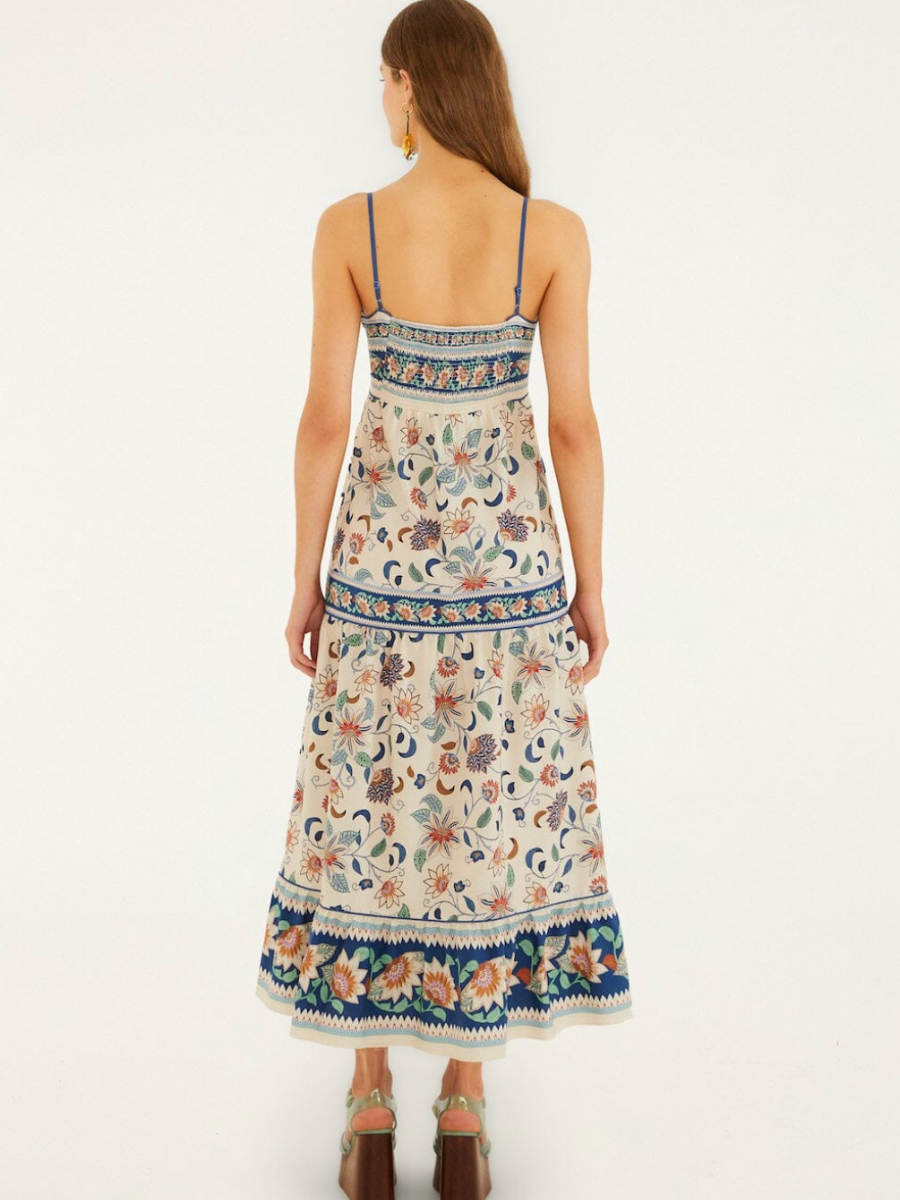 Embrace effortless charm with the Soft Pink Floral Delhi Tapestry Midi Dress by FARM Rio. Its delicate floral tapestry pattern blooms softly against a gentle pink backdrop, creating a romantic, sun-kissed feel. The structured square neckline frames the collarbone gracefully, while the flowing midi silhouette dances with every step. Subtle gathers add a touch of playful volume, making this dress a radiant expression of warmth and joyful elegance.