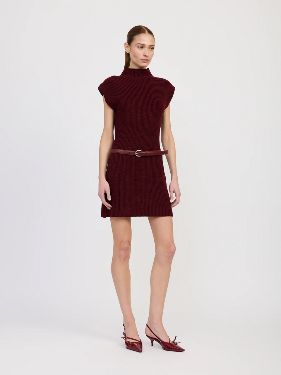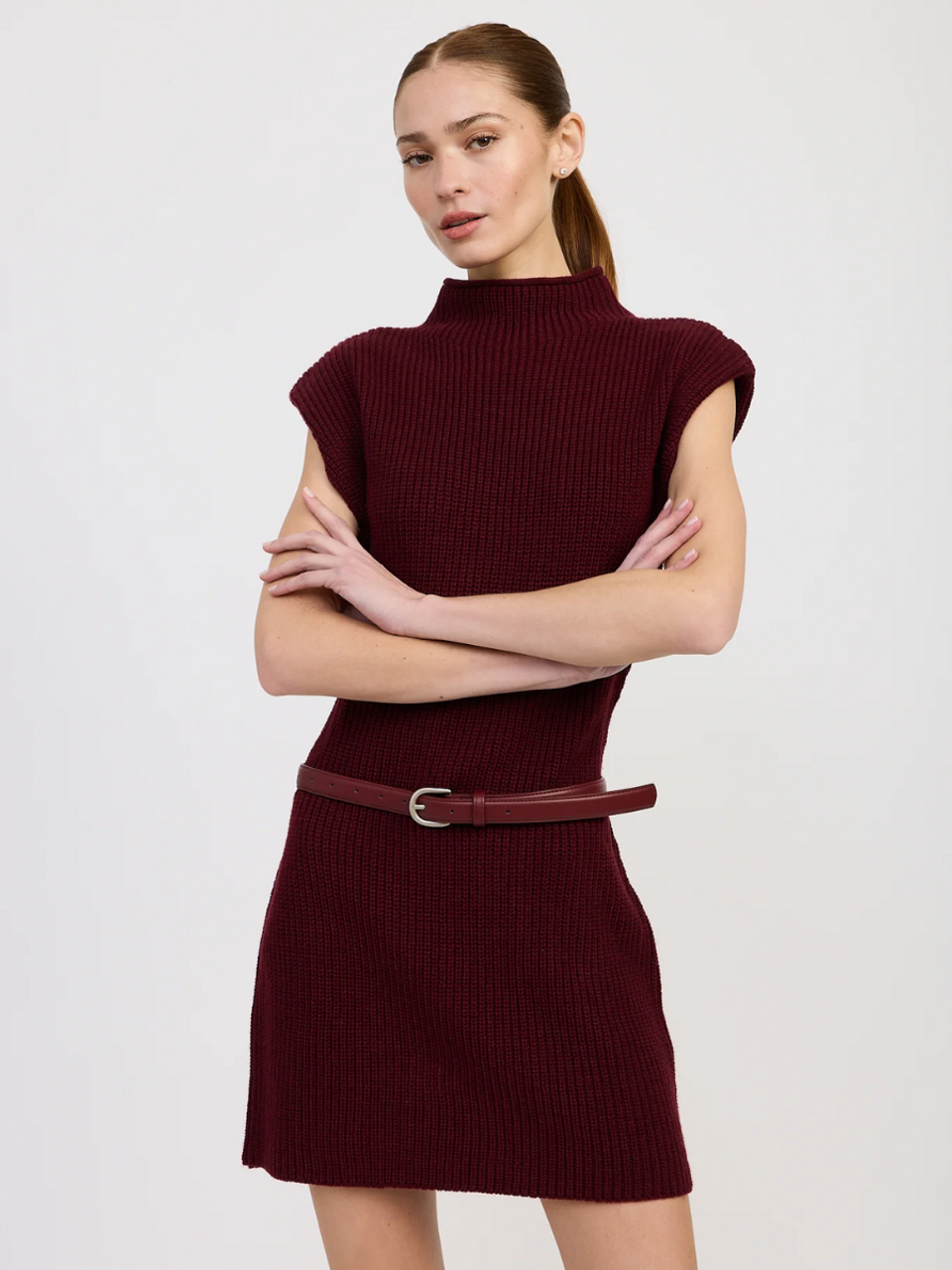 - High Neck Structured Shoulder Mini Sweater Dress With Included Slit