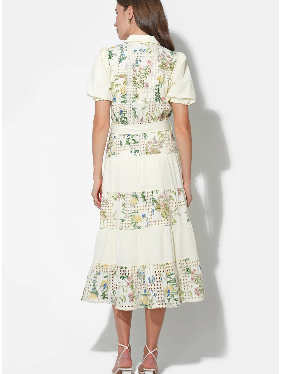 The defining characteristic is the combination of embroidery and eyelet fabric, which creates a delicate, intricate texture and pattern throughout. The silhouette is a graceful tiered midi dress, which means the skirt flows beautifully in soft layers, adding movement and volume to the elegant mid-calf length.