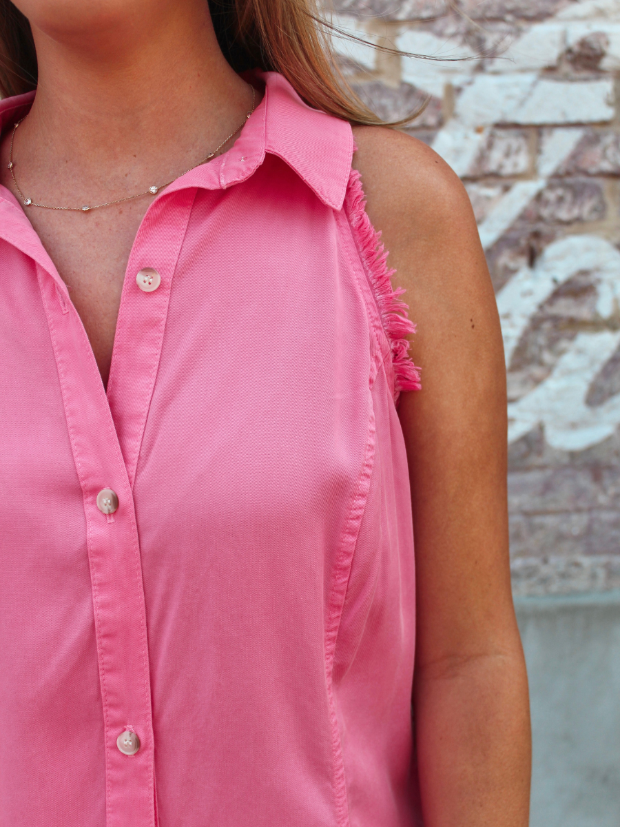 Our sleeveless pink button down dress is playful and flirty, just like you. The collar adds a touch of sophistication, while the tattered hemline gives it an edgy vibe. Whether you're heading to brunch with your girlfriends or a night out on the town, you'll turn heads in this dress. The lightweight fabric will keep you comfortable all day (or night!) long, while the flattering silhouette will make you feel confident and beautiful. Don't miss out on this must-have addition to your wardrobe!