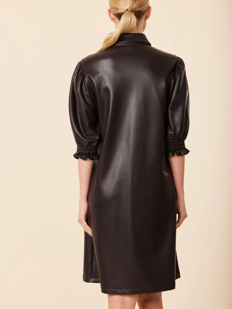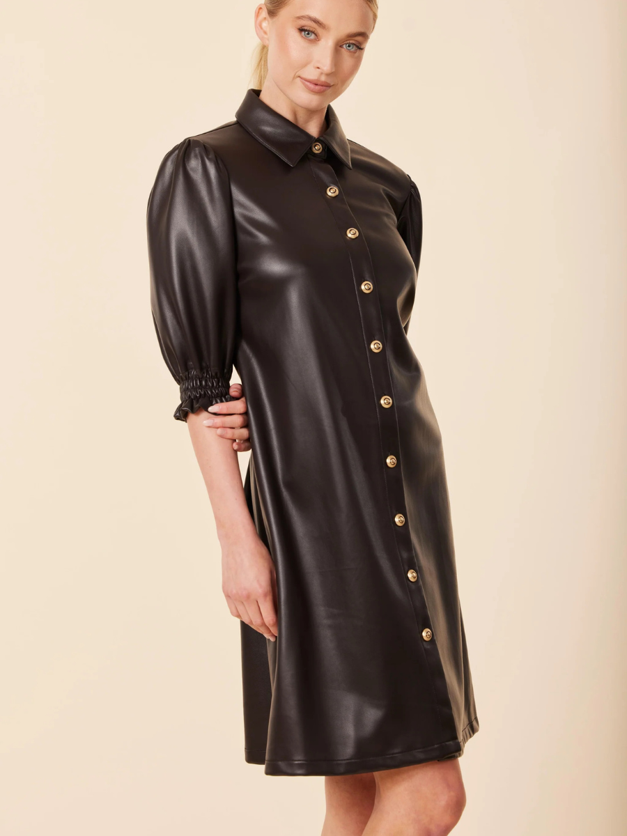 Step into Fall with this vegan leather button-down dress, available in dark brown and black. Featuring gold statement buttons, puff sleeves, and a relaxed A-line silhouette. Crafted from luxe faux leather, this versatile piece is perfect for fall outfits, work-to-evening transitions, and chic seasonal layering. Pair it with boots or heels for a polished, modern look.