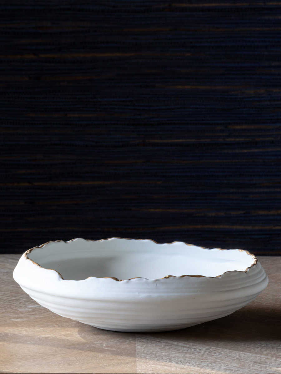 Park Hill's Gilded Organic collection includes artisan crafted white porcelain vessels with a glistening golden rim. The formal finishes modernize these organic containers that showcase ridges along their exterior from their thrown clay formation and beautifully imperfect edges along the opening, which are celebrated with gilded detail. This expertly formed and hand painted 9.25” bowl is wide and shallow. This contemporary piece is an exquisite shelf accessory, stylish catch-all bowl on a coffee table or counter, or a planter for a succulent garden that will allow its gold accent to shine.