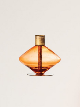 These hand-blown glass & brass-toned metal taper holders are perfect for your fall tablescape! Pair with different colors or style separately. Fits narrow-based taper candles. Due to the handmade nature of this item, each one will be unique! Slight variations in size and color are to be expected.
