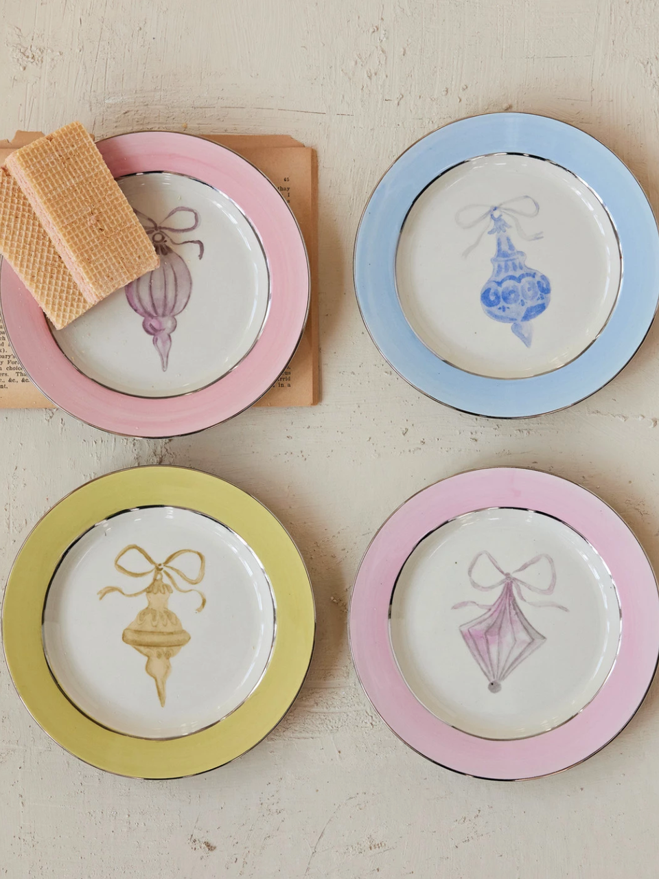 6" Round Stoneware Plate w/ Ornament Image & Silver Electroplated Edges