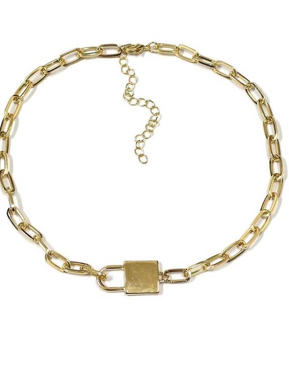 Medium thickness golden chain with lock shaped charm.