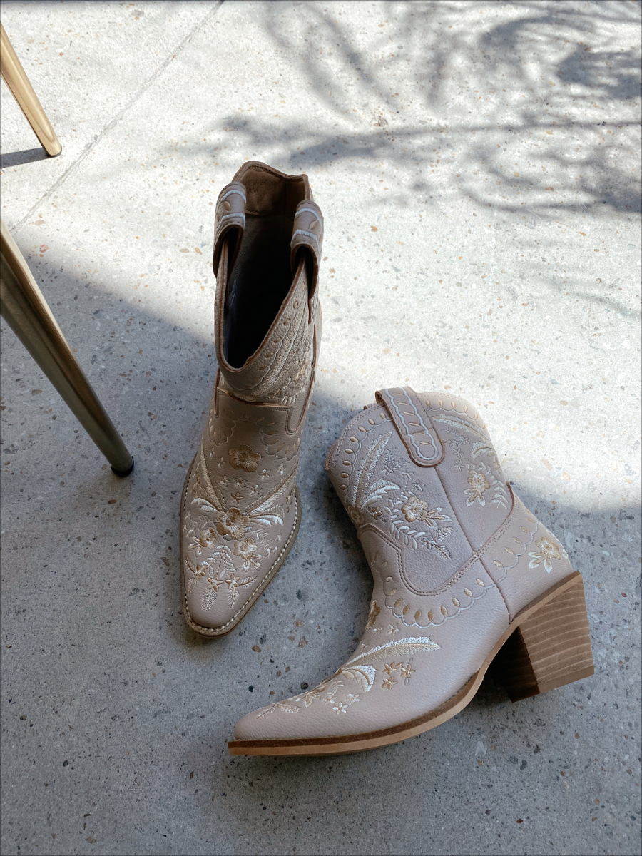 Classic point toe, eye-catching corral flora design on a western boot! An all-year-round boot with a bold look