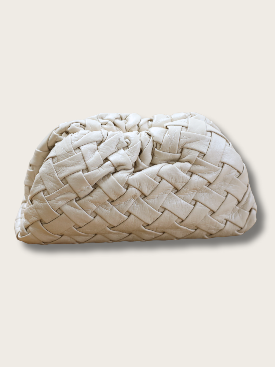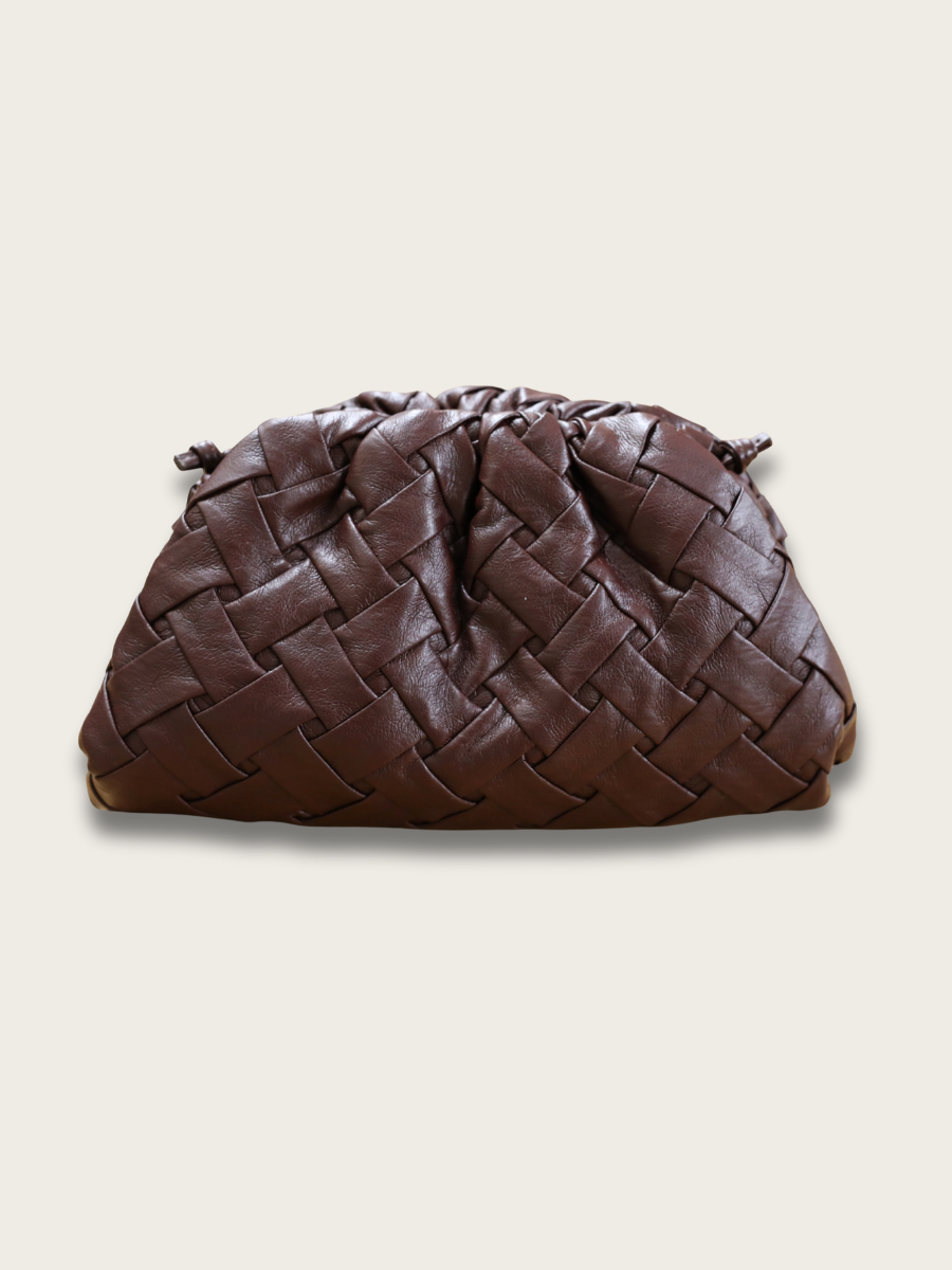 Woven soft vegan leather clutch with long crossbody strap attached